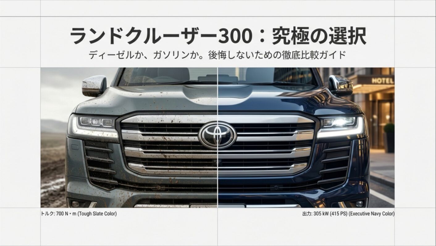 トヨタが世界に誇るフラッグシップSUV、ランドクルーザー300。この車を購入しようと考えたとき、多くの人が直面する最大の悩みが、ランクル300はディーゼルとガソリンどっちを選ぶべきかという問題ではないでしょうか。